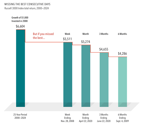 Hopefully, your answer is yes because the consequences of switching strategies at the wrong time can be severe. Dimensional Fund Advisors outlines these consequences in the graphic to the right. An investment of $1,000 in U.S. stocks (represented by the Russell 3000 Index) in the year 2000 would have grown to $6,604 by the end of 2024 if left continuously invested. However, those who pulled money out at inopportune times and missed the best week, month, 3 months, or 6 months during that timeframe would have lost at least $1,000 (upwards of $2,300) of that growth. And note that those periods of high growth occurred on the heels of the biggest market downturns during that time period—in late 2008 / early 2009 (Great Recession) and in the spring of 2020 (Covid) – when many investors were tempted to cut their losses and sell out of their stock funds.